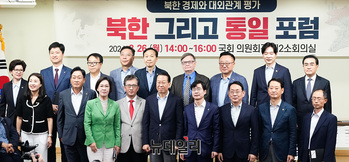 권영세, 김기웅, 김기현, 조경태 국민의힘 의원을 비롯한 참석자들이 26일 오후 서울 여의도 국회에서 북한 경제와 대외관계 평가를 주제로 열린 '북한 그리고 통일 포럼'에서 기념촬영을 하고 있다.