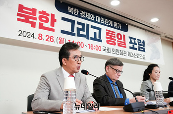 리일규 전 쿠바 주재 북한 대사관 정무참사가 26일 오후 서울 여의도 국회에서 북한 경제와 대외관계 평가를 주제로 열린 '북한 그리고 통일 포럼'에서 발제하고 있다.