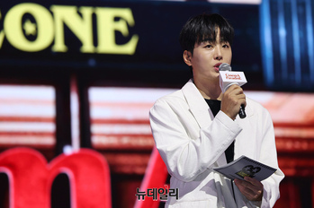 조정식 아나운서가 26일 오후 서울 용산구 블루스퀘어에서 열린 제로베이스원 미니 4집 '시네마 파라다이스' 쇼케이스에서 멤버를 소개하고 있다. 이번 앨범은 '다양한 삶의 과정에서 나쁜 상황에도 불구하고 해피엔딩을 꿈꾸는 사람들을 응원'하는 메시지를