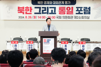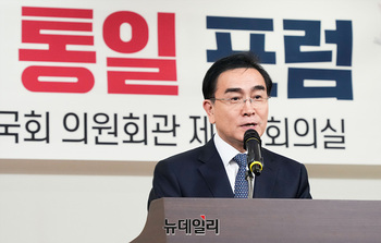 태영호 전 국민의힘 의원이 26일 오후 서울 여의도 국회에서 북한 경제와 대외관계 평가를 주제로 열린 '북한 그리고 통일 포럼'에서 축사를 하고 있다.