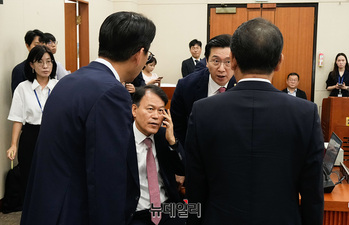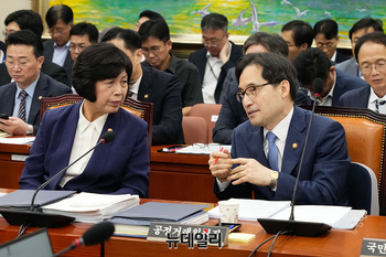 강정애 국가보훈부장관과 한기정 공정거래위원장이 26일 오전 서울 여의도 국회에서 열린 정무위원회에서 대화를 나누고 있다.