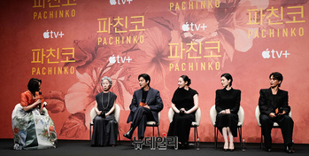 배우 윤여정, 이민호, 김민하, 정은채, 김성규가 23일 서울 강남구 그랜드 인터컨티넨탈 서울 파르나스에서 열린 Apple TV+ '파친코 시즌 2' 프레스 컨퍼런스에서 취재진의 질문에 답하고 있다. 드라마 '파친코 시즌2'는 고국을 떠나 억척스럽게 생존과 번