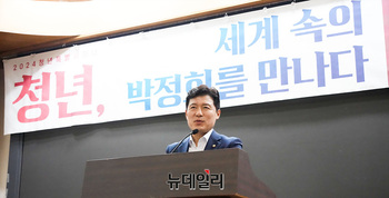 구자근 국민의힘 의원이 23일 오후 국회 의원회관에서 열린 '청년, 세계 속의 박정희를 만나다' 세미나에서 인사말을 하고 있다.