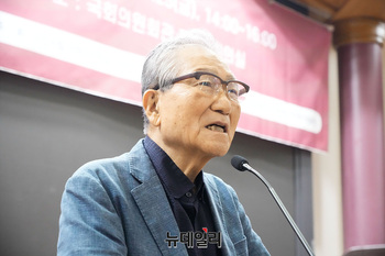 손병두 대한민국사랑회 이사장이 23일 오후 국회 의원회관에서 열린 '청년, 세계 속의 박정희를 만나다' 세미나에서 인사말을 하고 있다.