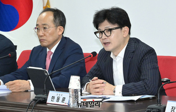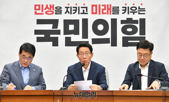 김상훈 국민의힘 정책위의장이 23일 오전 국회에서 열린 원내대책회의를 주재하고 있다. 이날 김 의장은 "기준금리 결정은 한은 금융통화위원회의 고유권한"아라며 "한은이 충분히 여러 경제 상황을 감안해 결정했을 것으로 생각하고 이를 존중한다"고 밝혔다.