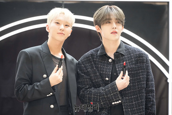 세븐틴 호시와 에스쿱스가 23일 오전 서울 중구 롯데백화점 본점에 마련된 뷰티 브랜드 '나스(NARS)' 익스플리싯 립스틱 팝업스토어에서 포즈를 취하고 있다.'나스 익스플리싯 립스틱'은 30주년을 기념해 출시됐다. 23일부터 25일까지 롯데백화점 본점 및 온라인 몰에서
