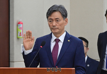 조지호 경찰청장이 20일 오후 국회 행정안전위원회에서 열린 마약수사 외압 의혹 관련 청문회에서 선서를 하고 있다.