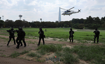 을지연습이 실시되고 있는 20일 오후 서울 송파구 올림픽공원에서 국가중요시설 합동 대테러훈련이 진행된 가운데 경찰특공대가 헬기에서 강하하고 있다.다중이용시설에서의 테러 대비 태세를 확립하고자 기획된 이번 훈련에는 육군 52사단, 수도방위사령부, 송파구, 지역경찰서·소방