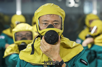 오세훈 서울시장이 19일 오후 서울 중구 서울시청에서 열린 2024 을지연습 연계 화생방 상황 훈련에서 방독면 착용 훈련을 하고 있다.