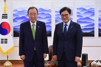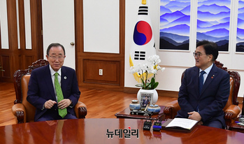 우원식 국회의장이 19일 오후 국회에서 반기문 전 유엔 사무총장을 접견하고 있다.