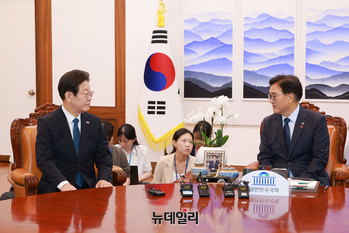 이재명 더불어민주당 대표가 19일 오후 국회에서 우원식 국회의장을 예방해 환담을 나누고 있다.