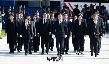 이재명 신임 더불어민주당 대표와 지도부가 19일 오전 서울 동작구 국립서울현충원 현충탑에서 참배하기 위해 이동하고 있다.