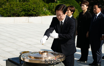이재명 신임 더불어민주당 대표가 19일 오전 서울 동작구 국립서울현충원 현충탑에서 분향하고 있다.