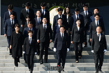 이재명 신임 더불어민주당 대표와 지도부가 19일 오전 서울 동작구 국립서울현충원 현충탑에서 참배를 마치고 이동하고 있다.