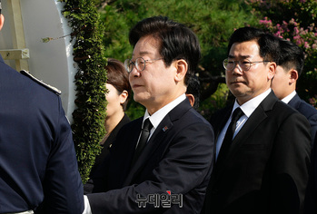 이재명 신임 더불어민주당 대표가 19일 오전 서울 동작구 국립서울현충원 현충탑에서 헌화하고 있다.