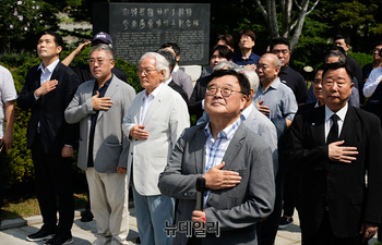 이승만 숭모 헌화회와 참석자들이 15일 오전 서울 동작구 국립서울현충원 이승만 전 대통령 묘역에서 열린 '건국대통령이승만 숭모헌화회 광복절 헌화행사'에서 국민의례를 하고 있다.