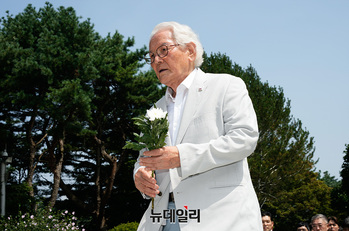 이영일 전 국회의원이 15일 오전 서울 동작구 국립서울현충원 이승만 전 대통령 묘역에서 열린 '건국대통령이승만 숭모헌화회 광복절 헌화행사'에서 헌화하고 있다.
