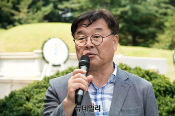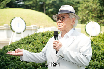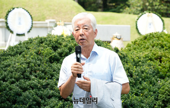 이영일 전 국회의원이 15일 오전 서울 동작구 국립서울현충원 이승만 전 대통령 묘역에서 열린 '건국대통령이승만 숭모헌화회 광복절 헌화행사'에서 인사말을 하고 있다.