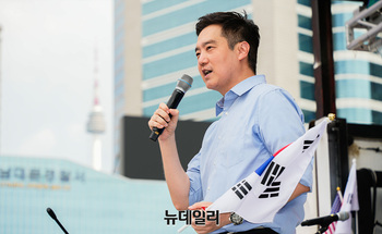 김세의 가로세로연구소 대표가 15일 오후 서울역 앞에서 열린 광복 79주년·건국 76주년 태극기 집회에서 발언하고 있다.