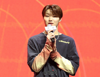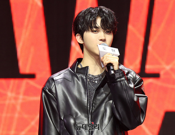 루네이트(LUN8) 준우가 14일 오후 서울 광진구 예스24라이브홀에서 열린 3번째 미니앨범 'AWAKENING(어웨이크닝)' 쇼케이스에서 포즈를 취하고 있다. 이번 앨범은 청춘의 일탈과 자유로움을 표현하며 '지금 이 순간만큼은 걱정 없이 자유롭게 즐기자'는