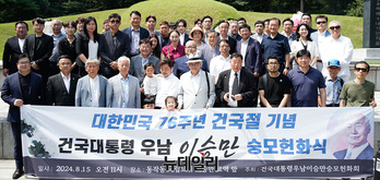 이승만 숭모 헌화회와 참석자들이 15일 오전 서울 동작구 국립서울현충원 이승만 전 대통령 묘역에서 열린 '건국대통령이승만 숭모헌화회 광복절 헌화행사'에서 기념촬영을 하고 있다.