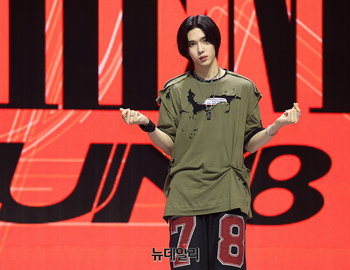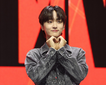 아이돌그룹 루네이트(LUN8) 리더 진수가 14일 오후 서울 광진구 예스24라이브홀에서 열린 3번째 미니앨범 'AWAKENING(어웨이크닝)' 쇼케이스에서 포즈를 취하고 있다. 이번 앨범은 청춘의 일탈과 자유로움을 표현하며 '지금 이 순간만큼은 걱정 없이 자유