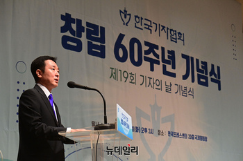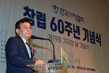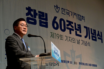 박종현 한국기자협회장이 13일 서울 중구 프레스센터에서 열린 한국기자협회 창립 60주년 기념식에서 인사말을 하고 있다.