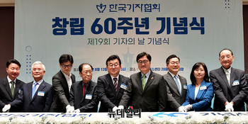 박종현 한국기자협회장, 우원식 국회의장, 한동훈 국민의힘 대표, 박찬대 더불어민주당 대표 직무대행 겸 원내대표 등 참석자들이 13일 서울 중구 프레스센터에서 열린 한국기자협회 창립 60주년 기념식에서 떡케익을 컷팅하고 있다.