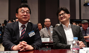 박종현 한국기자협회장과 한동훈 국민의힘 대표가 13일 서울 중구 프레스센터에서 열린 한국기자협회 창립 60주년 기념식에서 대화를 나누고 있다.