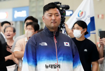 김우진 양궁 국가대표 선수가 13일 오후 인천국제공항 2터미널에서 열린 2024 파리올림픽 선수단 해단식에 참석하고 있다.대한민국은 이번 파리올림픽에서 금메달 13개, 은메달 9개, 동메달 10개를 따내며 종합 순위 8위를 기록했다. (인천=서성진 기자)