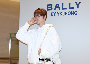 제로베이스원 규빈이 13일 오전 서울 강남구 현대백화점 무역센터점에서 열린 'BALLY BY YK JEONG' 캡슐 컬렉션 런칭행사에 참석해 포즈를 취하고 있다. 'BALLY BY YK JEONG' 캡슐은 발리와 스타일리스트 정윤기가 콜라보레이션으로 선보이는