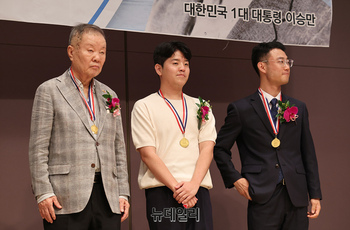 제17회 우남이승만애국상시상식 수상자들이 12일 오후 서울 중구 한국프레스센터에서 열린 시상식에 참석해 자리하고 있다. 이날 시상식에는 △김박 앨트웰텍 회장(대상) △김지성 신 전대협 대구·경북지부 지부장(청년상) △권영찬 제1기 트루스포럼 학부생 대표(청년상)가 각각