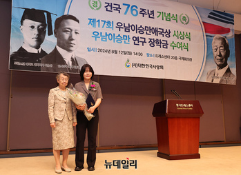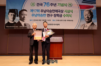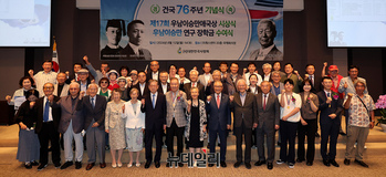 대한민국 건국 76주년을 맞아 제17회 '우남이승만애국상' 시상식이 대한민국사랑회 주최로 14일 오후 서울 중구 한국프레스센터에서 열렸다. 이날 김박 앨트웰텍㈜ 회장이 대상을, 김지성 전 전대협 대구·경부지부 지부장, 권영찬 제1기 트루스포럼 학부생 대표가 각