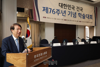 정운찬 전 국무총리가 12일 오후 서울 중구 한국프레스센터에서 이승만건국대통령기념사업회가 주최한 '대한민국 건국 제76주년 기념 학술대회'에서 인사말을 하고 있다. 학술대회는 △이승만 건국대통령에 대한 오해와 진실 △다큐멘터리 백년전쟁 대법원 판례평석 및 대책