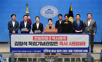 더불어민주당 박범계, 박수현, 강준현, 황명선, 황정아 등 충청권 의원들이 12일 오후 국회 소통관에서 기자회견을 열고 김형석 독립기념관 관장 임명 철회를 촉구하고 있다.