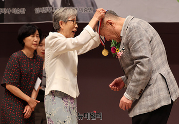 김박 앨트웰텍 회장이 12일 오후 서울 중구 한국프레스센터에서 열린 제17회 우남이승만애국상시상식에서 김길자 전 경인여대 총장에게 대상을 수여 받고 있다. 제17회 우남이승만 애국상은 △김박 앨트웰텍 회장(대상) △김지성 신 전대협 대구·경북지부 지부장(청년상