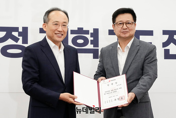 추경호 국민의힘 원내대표가 12일 오후 서울 여의도 국회에서 열린 포털 불공정 개혁 TF 전체회의에서 김장겸 의원에게 임명장을 전달한 뒤 기념촬영을 하고 있다.