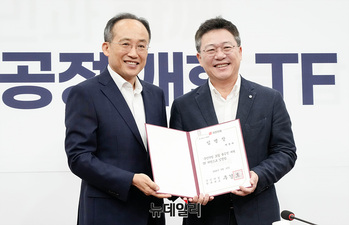 추경호 국민의힘 원내대표가 12일 오후 서울 여의도 국회에서 열린 포털 불공정 개혁 TF 전체회의에서 김시관 의원에게 임명장을 전달한 뒤 기념촬영을 하고 있다.