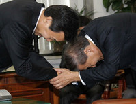 손학규 민주당 대표와 이재오 특임장관이 8일 은근한 신경전을 펼쳤다. 이 장관이 대표 선출 축하 인사차 국회 민주당 대표실로 손 대표를 방문한 자리에서다.과거 박정희 군사정권에 맞서 한일 국교정상화 반대시위를 주도했던 '6.3' 동지이자 15대.16대 국회때 같이 한나