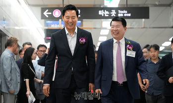 오세훈 서울시장과 백경현 구리시장이 9일 오후 경기 남양주 별내역에서 열린 지하철 8호선 별내선 개통식을 마치고 시승을 위해 이동하고 있다.지하철 8호선 연장 별내선은 서울 강동구 암사역에서 경기 남양주 별내역까지 모두 6개 역(암사, 선사, 토평, 구리, 구리도매시장