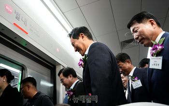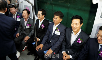 김동연 경기도지사, 박상우 국토교통부 장관, 오세훈 서울시장을 비롯한 참석자들이 9일 오후 경기 남양주 별내역에서 열린 지하철 8호선 별내선 개통식을 마치고 시승하고 있다.지하철 8호선 연장 별내선은 서울 강동구 암사역에서 경기 남양주 별내역까지 모두 6개 역(암사,