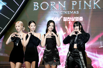 걸그룹 블랙핑크(BLACK PINK)가 9일 오후 서울 영등포구 타임스퀘어 영등포점에서 열린 '본 핑크 인 시네마스(BORN PINK IN CINEMAS)' 핑크 카펫에서 포즈를 취하고 있다.