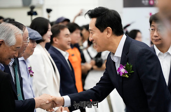 오세훈 서울시장이 9일 오후 경기 남양주 별내역에서 열린 지하철 8호선 별내선 개통식에 참석하며 시민대표와 악수를 나누고 있다.지하철 8호선 연장 별내선은 서울 강동구 암사역에서 경기 남양주 별내역까지 모두 6개 역(암사, 선사, 토평, 구리, 구리도매시장, 다산(진건