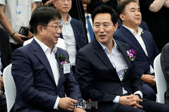 박상우 국토부 장관과 오세훈 서울시장이 9일 오후 경기 남양주 별내역에서 열린 지하철 8호선 별내선 개통식에서 대화를 나누고 있다.지하철 8호선 연장 별내선은 서울 강동구 암사역에서 경기 남양주 별내역까지 모두 6개 역(암사, 선사, 토평, 구리, 구리도매시장, 다산(