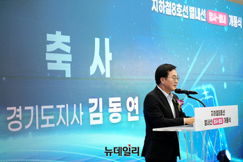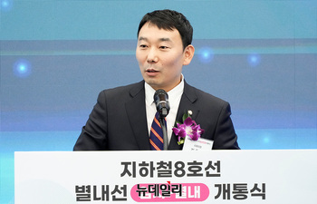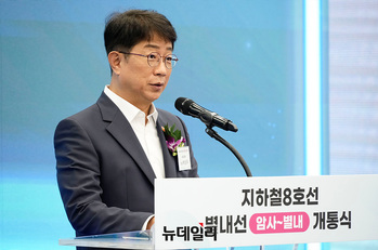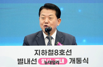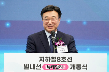 김동연 경기도지사가 9일 오후 경기 남양주 별내역에서 열린 지하철 8호선 별내선 개통식에서 축사를 하고 있다.지하철 8호선 연장 별내선은 서울 강동구 암사역에서 경기 남양주 별내역까지 모두 6개 역(암사, 선사, 토평, 구리, 구리도매시장, 다산(진건), 별내)을 연결