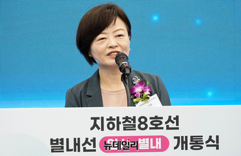 더불어민주당 소속 최민희 과방위원장이 9일 오후 경기 남양주 별내역에서 열린 지하철 8호선 별내선 개통식에서 축사를 하고 있다.지하철 8호선 연장 별내선은 서울 강동구 암사역에서 경기 남양주 별내역까지 모두 6개 역(암사, 선사, 토평, 구리, 구리도매시장, 다산(진건