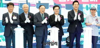 김동연 경기도지사, 박상우 국토교통부 장관, 오세훈 서울시장을 비롯한 참석자들이 9일 오후 경기 남양주 별내역에서 열린 지하철 8호선 별내선 개통식에서 기념촬영을 하고 있다.지하철 8호선 연장 별내선은 서울 강동구 암사역에서 경기 남양주 별내역까지 모두 6개 역(암사,