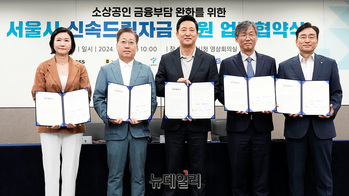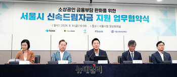 이은미 토스뱅크 대표(왼쪽부터), 윤호영 카카오뱅크 대표, 오세훈 서울시장, 최우형 케이뱅크 대표, 주철수 서울신용보증재단 이사장이 9일 오전 서울 중구 서울시청에서 열린 '서울시 신속드림자금 지원 업무협약식'에서 기념촬영을 하고 있다.