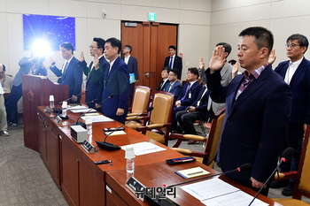 조성은 방송통신위원회 사무처장 및 증인들이 9일 국회 과학기술정보방송통신위원회에서 열린 불법적 방송문화진흥회 이사 선임 등 방송장악 관련 1차 청문회에서 증인선서를 하고 있다.