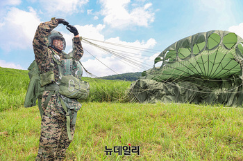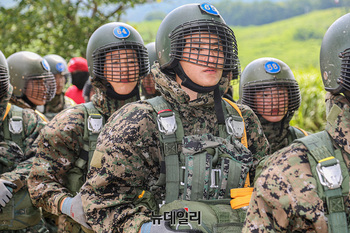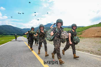 육군사관학교 3학년 생도들이 8월 7일 특수전학교에서 진행된 공수기본훈련 중 강하를 성공적으로 마친 후 자신감 충만하게 '화이팅!'을 외치며 복귀하고 있다.육사 생도들은 지난 7월 초부터 이번 주까지 6주간 진행된 하계군사훈련을 성공적으로 마무리했다. 훈련 기간 동안